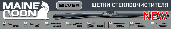 В ассортименте представлены щетки стеклоочистителя Maine Coon серии Silver от компании Mackenzy Technology Inc. Для производства этой серии щеток выбрана наиболее прогрессивная бескаркасная технология.